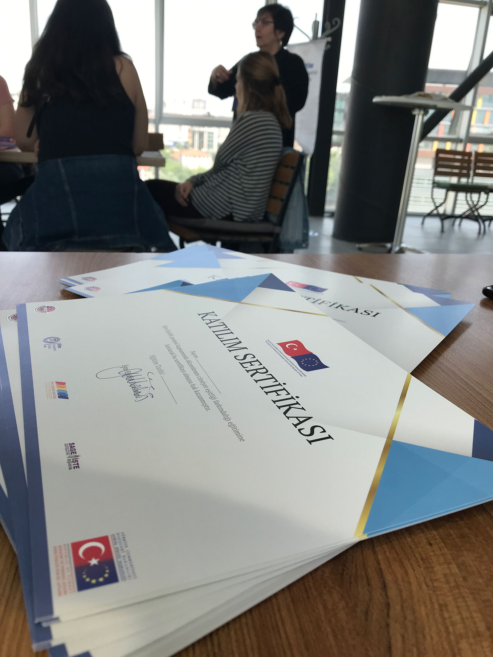 Öğrencilerin konuya ilgilerine ve eğitime katılımlarına teşekkür etmek ve öğrenilenlerin hatırda kalmasını sağlamak amacıyla öğrencilere üzerinde logolar ve eşitliğe ilişkin çeşitli istatistiki veriler bulunan çanta ve defterler ile kalem hediye ettik. Eğitim içeriğini destekleyen, eğitim esnasındaki soruların kimi cevaplarını içeren “Asi Kızlar Bilge Kadınlar” kitabı da yine eğitime katılan öğrencilere proje nezdinde hediye edildi. Ayrıca, öğrencilere katılım sertifikaları vererek katılımlarını kayıtlamalarını sağladık. Sertifikalar “Cinsiyet Eşitliği Farkındalığı Eğitimleri Katılım Sertifikası” adıyla program direktörü ıslak imzasıyla isim bazında hazırlandı.